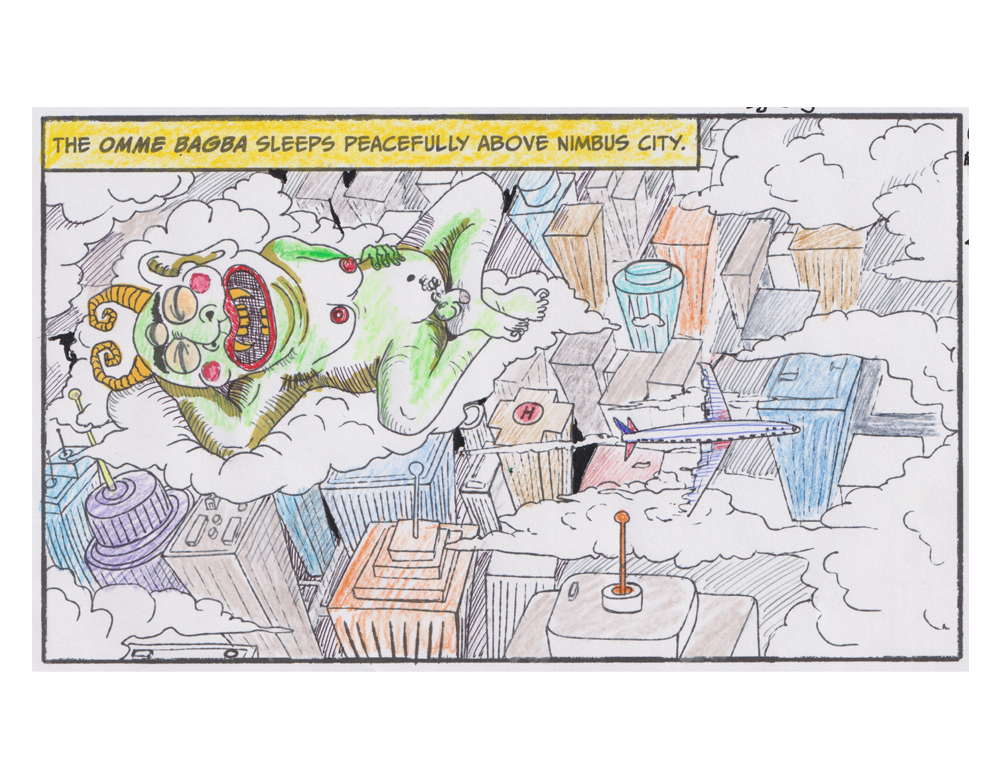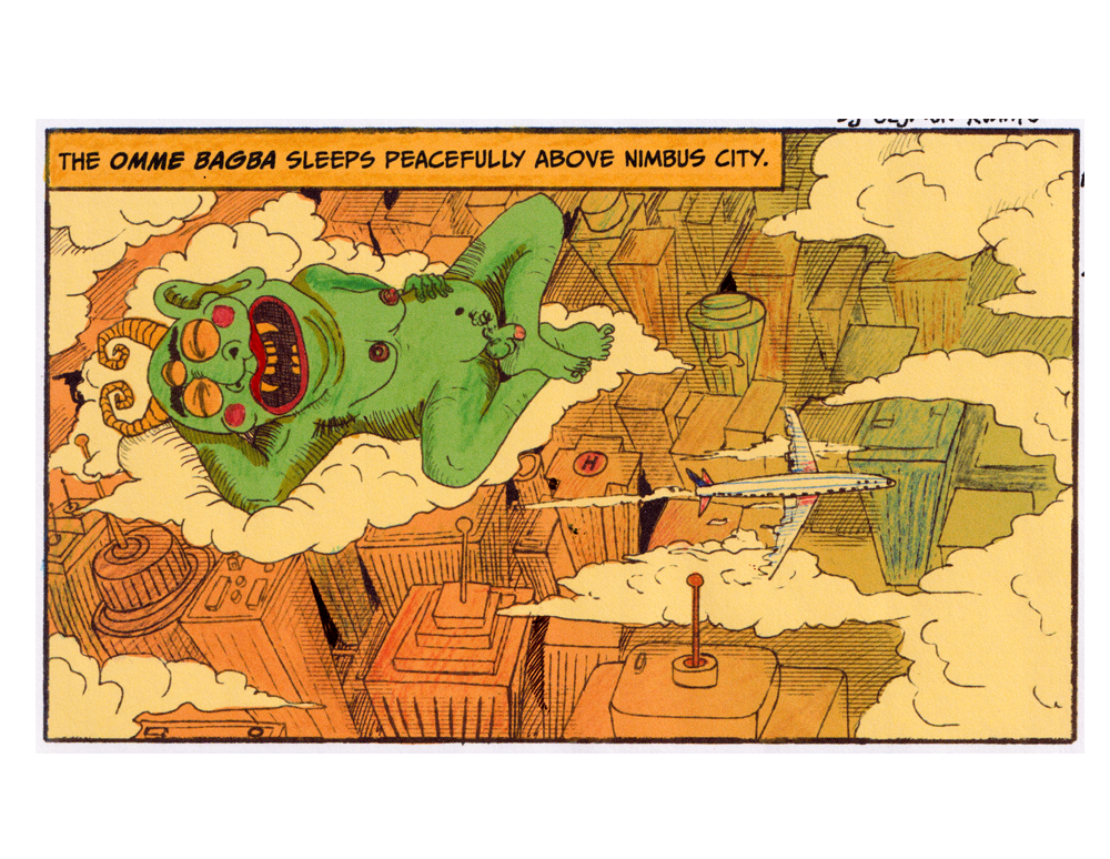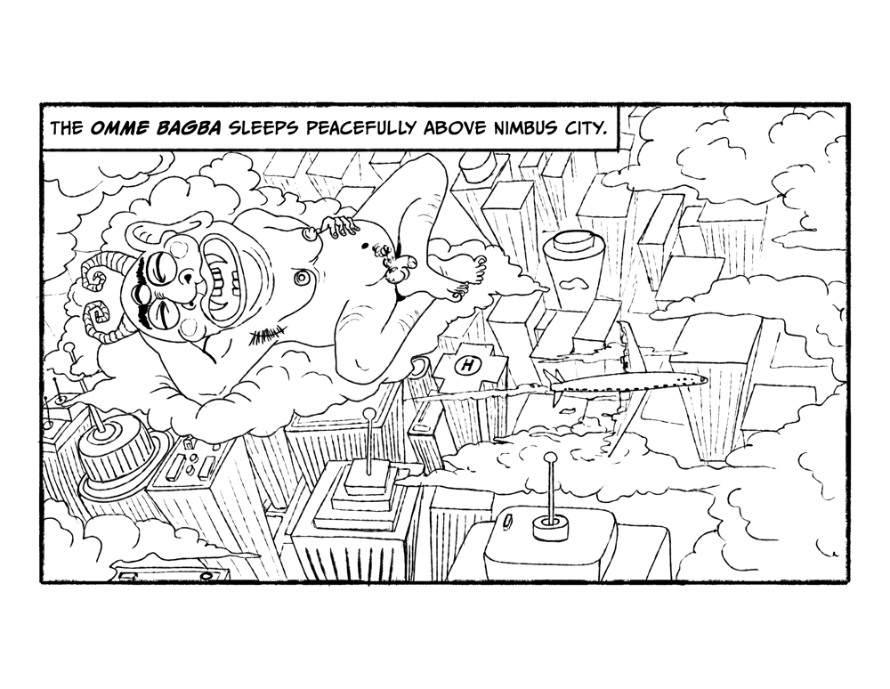 Nimbus World was once ruled by demi gods named OMME but for some time now the OMME have gotten tired, lazy and subdued. As they slumber in clouds above the common people the world below have been plunged into daily chaos. Political corruption, riots, civil unrest, unfair dystopic nonsense is all rife in Nimbus World, but our story focuses not on the mighty and powerful or the uprising brewing beneath the boot of tyranny but on those just trying to live through this strange world. We start our story with friends Alfonso and Topher on a seemingly simple quest to get a new printer.