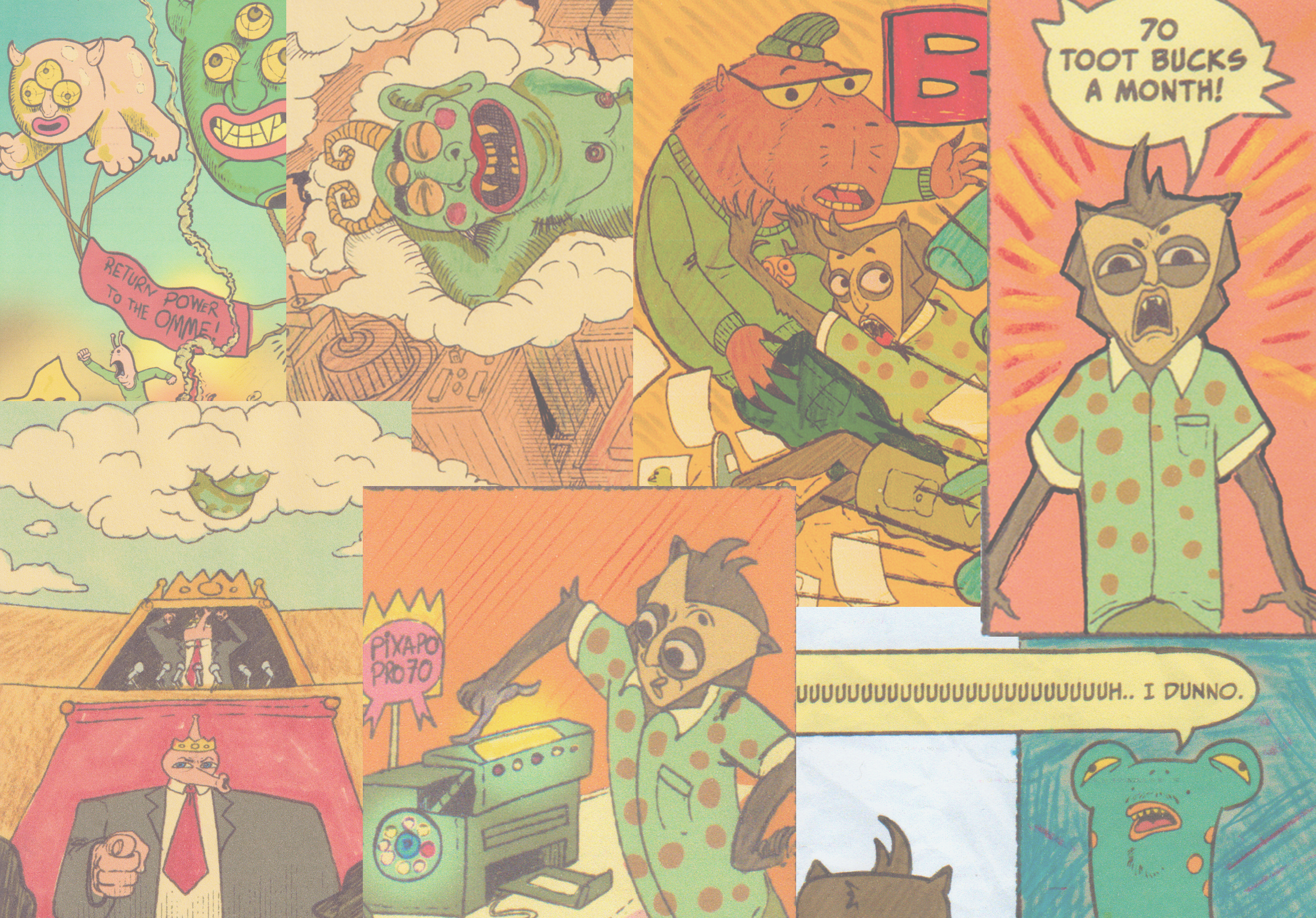 Each page is crafted by hand. Panels are first drawn by hand on individual pages then are scanned in and laid out digitally. Then the panels are inked digitally and printed out to be colored and roughed up with mixed media (pencils, ink, crayons, and whatever else I got laying around). The pages are then rescanned into my computer and colored up digitally only to be printed one final time and roughed up one more time and then scanned and finalized. Every stage is made by a human hand… a stinky weird human who is me! No bullshit AI slop here… just good old fashioned human slop! My terrible printer produces this strange grimy look that for some reason I am obsessed with.